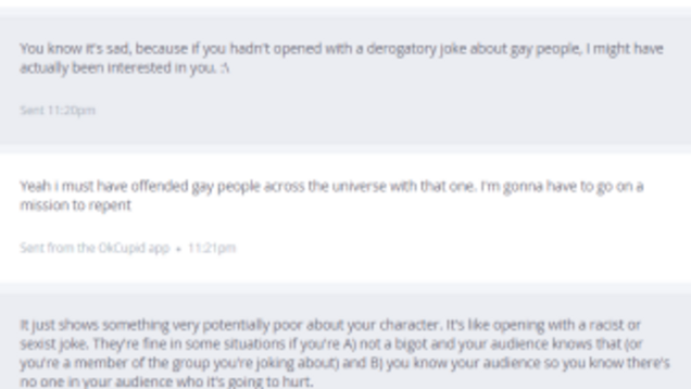My “good luck” was sarcastic both times, but I doubt he’s smart enough to catch that I’m pretty sure he is going to get 0 relationships and probably 0 sexing out of his OkCupiding.